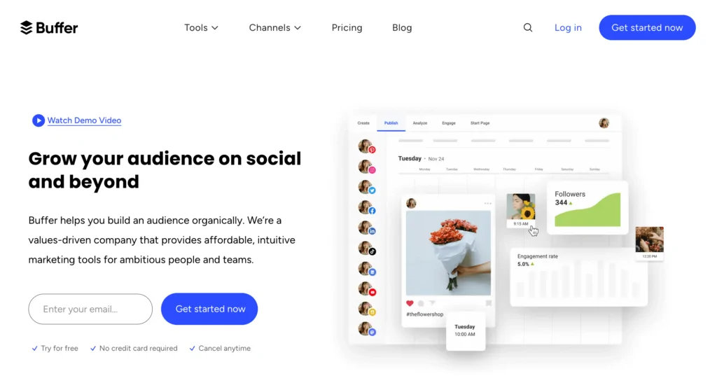| Buffer | Easy scheduling, AI assistant, the best time to post, hashtag manager | Free up to 3 channels. Essentials plan starts at $5 monthly per social channel |