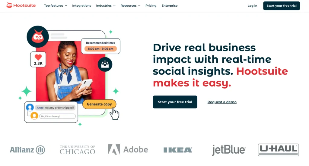 | Hootsuite | Post scheduling, AI Content creation, advanced analytics, custom heatmap for best posting times | $99 per month (Professional) |