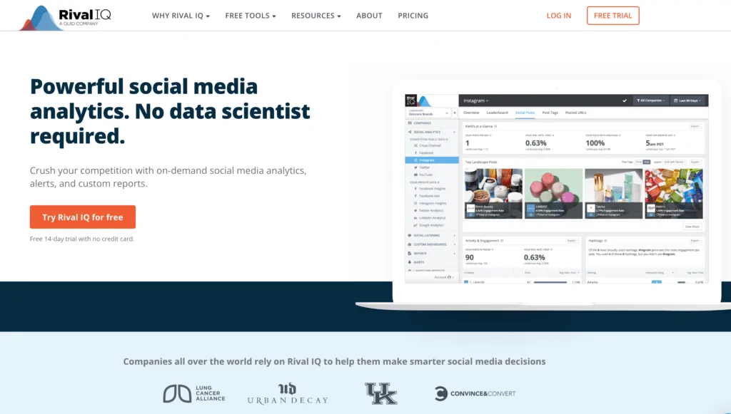 | Rival IQ | Competitive analysis, social media audits, hashtag analytics, automated reports | $239 per month (Starter) |