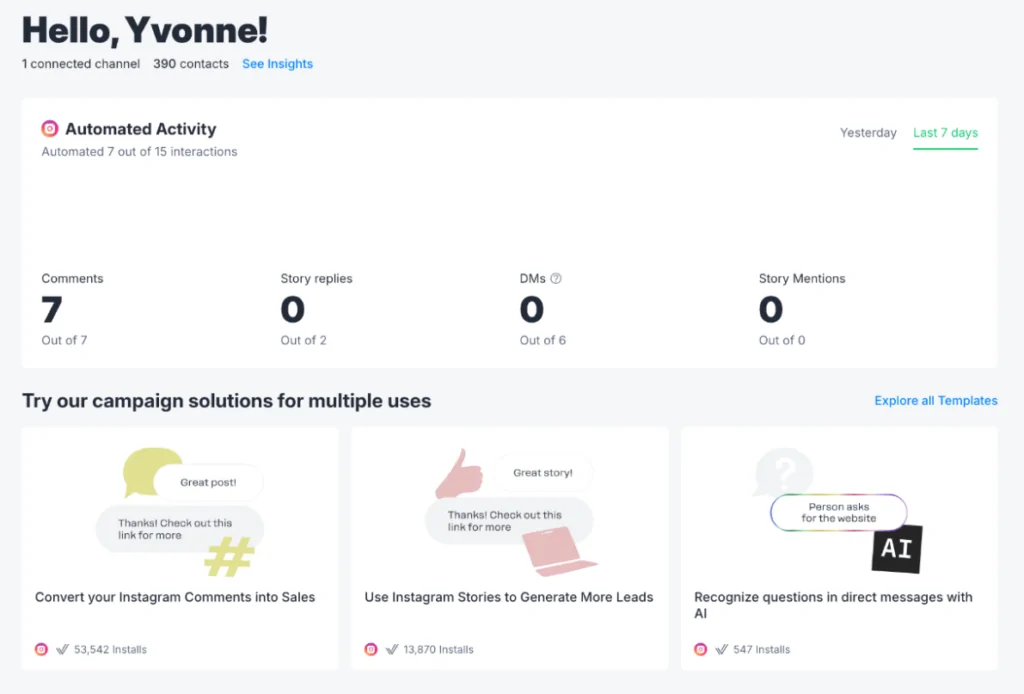 ☝️My tip: Two of my favorite pre-built templates include converting comments into sales and using Instagram stories to generate more leads. Both of these templates work by setting up a specific keyword that users comment or DM, triggering an automated message to their DMs and starting a conversation. I love using this method to offer a free ebook and collect email addresses quickly and efficiently.